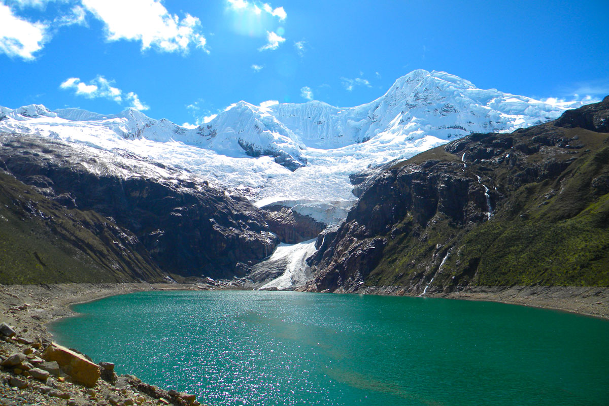 cumbre de Santa Cruz (6259 m). laguna azul cristalina Laguna Cullicocha (4650m);