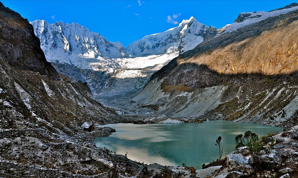 Upon entering the Huascarán National Park, the landscape transforms into a dramatic high-altitude environment with rocky cliffs, small waterfalls, and pristine alpine vegetation. The drive continues up to the Llaca Refuge, from where it is possible to take a short hike along the edge of Laguna Llaca to admire the lagoon’s turquoise waters and the spectacular ice walls of Ranrapalca and Ocshapalca towering above.