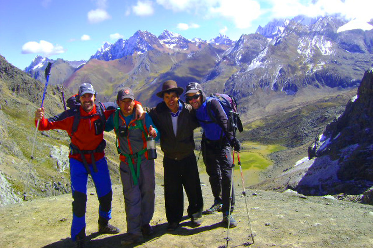 A hora indicada luego del desayuno iniciamos con la caminata esta vez nos dirigimos hacia el paso Punta Unión 4750m a donde llegamos luego de caminar 3 horas, desde este punto se puede apreciar las montañas alrededor tales como: Taulliraju,